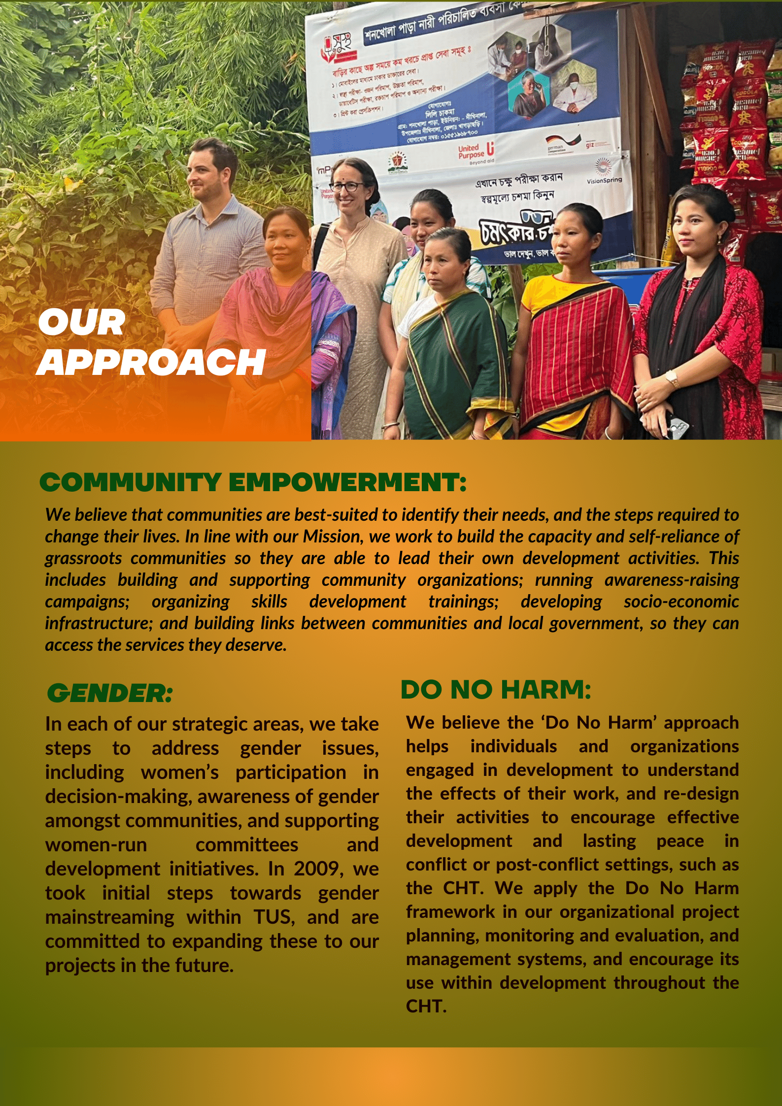 Trinamul Unnayan Sangstha (TUS) is an organization for community development based in Chittagong Hill Tracts which was established on 15 March in 1997 by a group of dedicated social activists. From the beginning we have aimed to empower grassroots communities of the Chittagong Hill Tracts (CHT), so they can take action on the social and economic challenges they face. Since our establishment, we have led the mission successfully more than one decade as a non-governmental, non-profit and non-political organization. We are now a leading local NGO in Khagrachari District, and have experience in undertaking a range of short and long-term projects on livelihoods, environment, biodiversity, traditional knowledge, water and sanitation, hygiene education practices, primary health care, Sexual and Reproductive Health Rights (SRHR), good governance, and education issues.