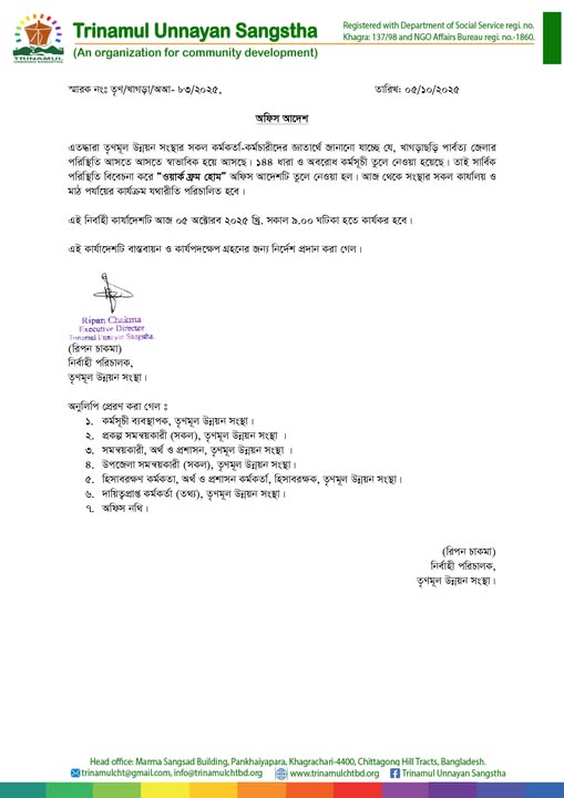 সার্বিক পরিস্থিতি বিবেচনা করে “ওয়ার্ক ফ্রম হোম” এর অফিস আদেশটি তুলে নেওয়া হল। আজ থেকে সংস্থার সকল কার্যালয় ও মাঠ পর্যায়ের কার্যক্রম যথারীতি পরিচালিত হবে।
